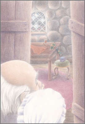 "As the shoemaker and his wife watched from the cupboard, the two little elves skipped over to the worktable."